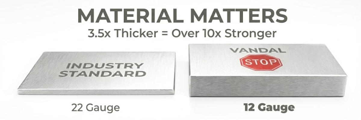 The "gauge" of steel refers to its thickness and the higher the number, the thinner the material while the lower the number, the thicker the material. To give an idea of the actual relative size between these different thicknesses, you can refer to this chart. Here you can see that the industry-standard (Bobrick or Bradley Stainless Steel Dispensers) use 22-gauge stainless and their "Heavy Duty" dispensers use 18-gauge stainless steel. Our own 12-gauge material is 4X the thickness of 22-gauge and over 2X+ the thickness of 18-gauge material. This results in massive additional strength that we put to good use to ensure our products truly meet the definition of tamper-proof.